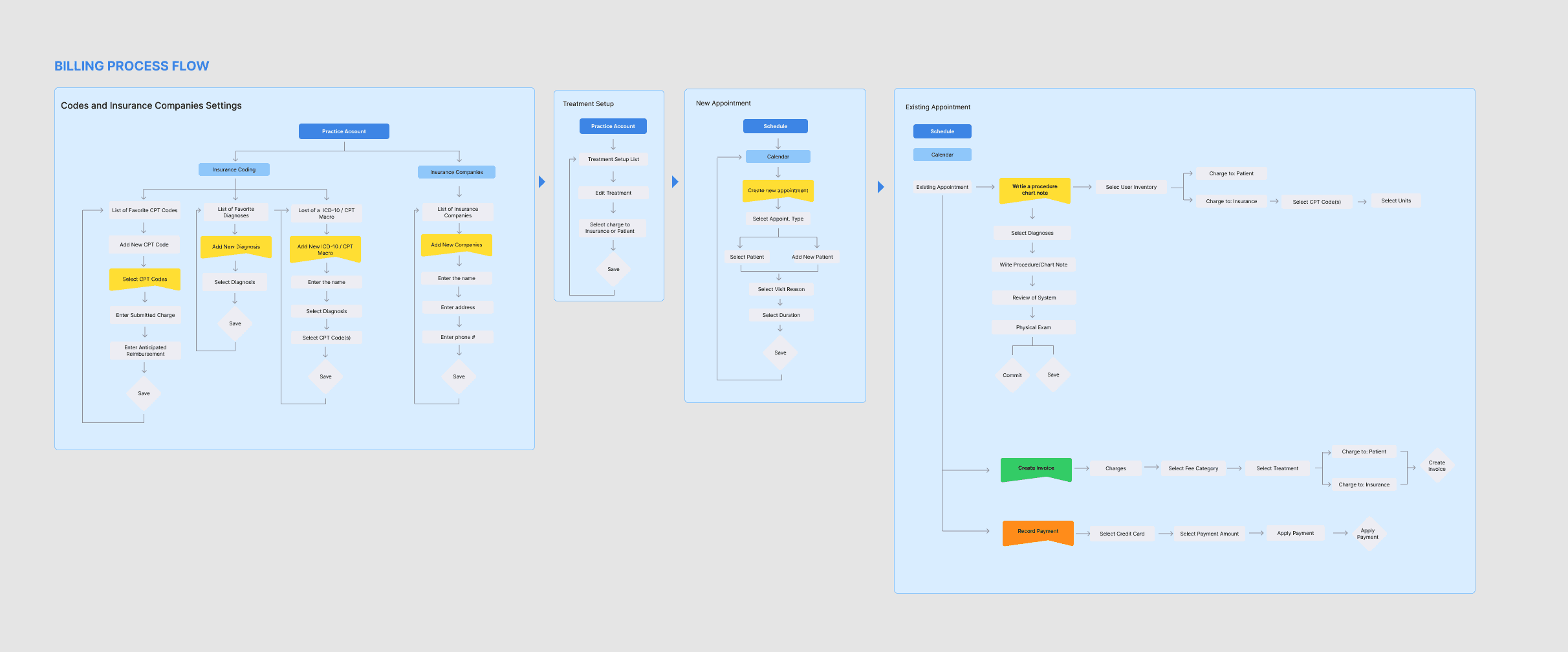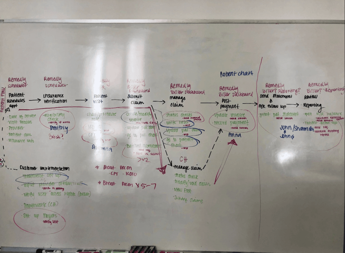 To fully understand Remedly's billing ecosystem, I created a detailed sitemap and process flows covering the entire billing cycle — from initial codes and insurance settings through new and existing appointments, all the way to payment reconciliation.