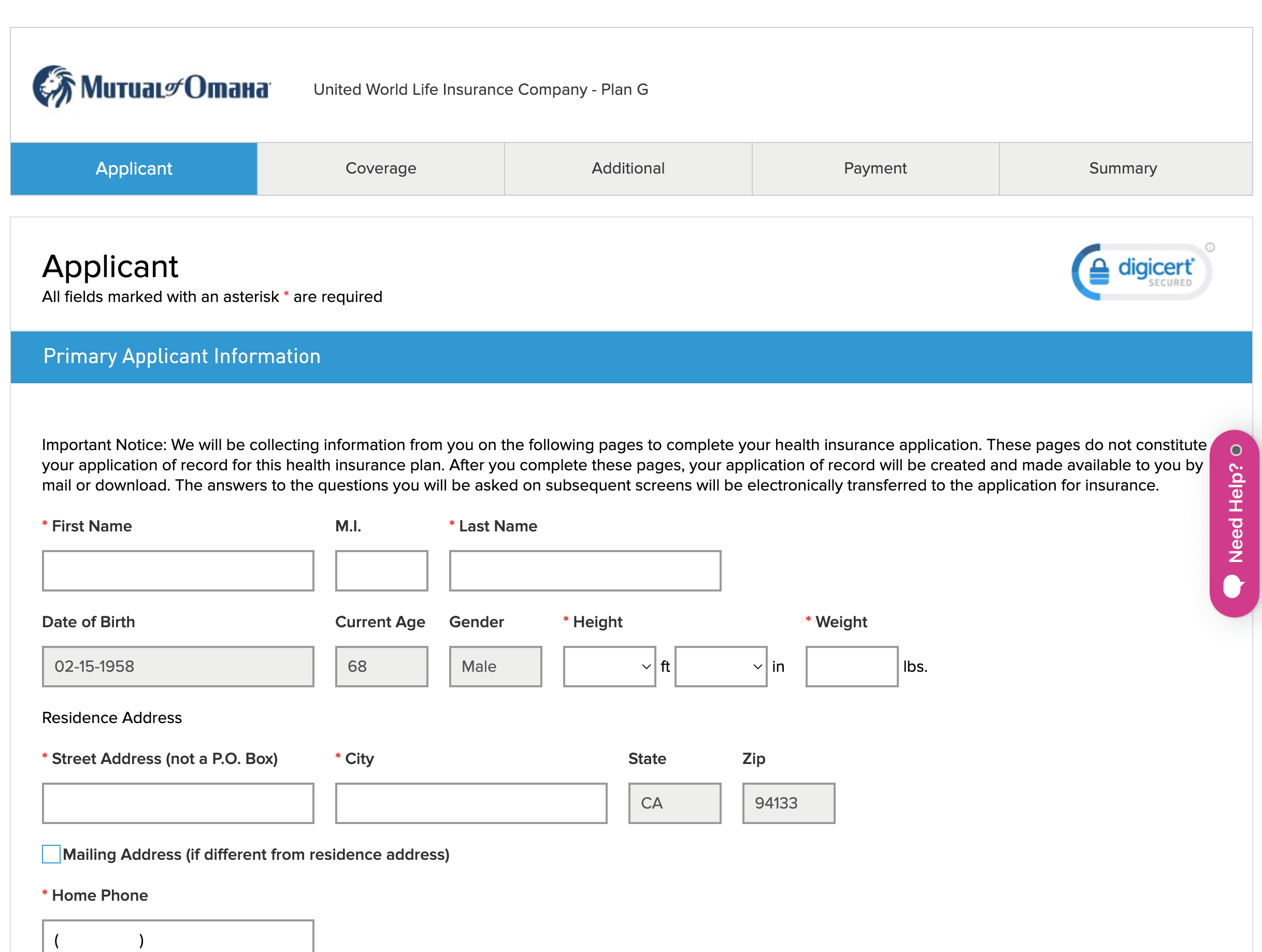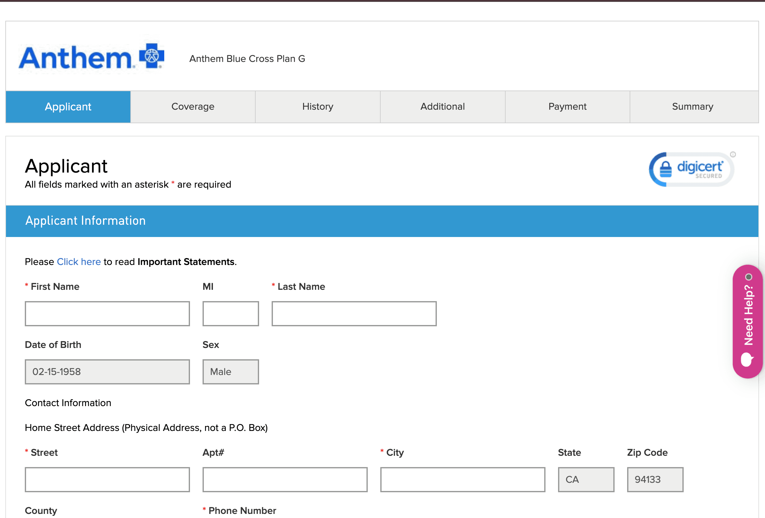The result: a single flow that handles Applicant Information → Coverage → Eligibility → (conditional: Health History + Health Questions) → Additional → Payment → Summary — for every carrier, without fracturing the experience.
