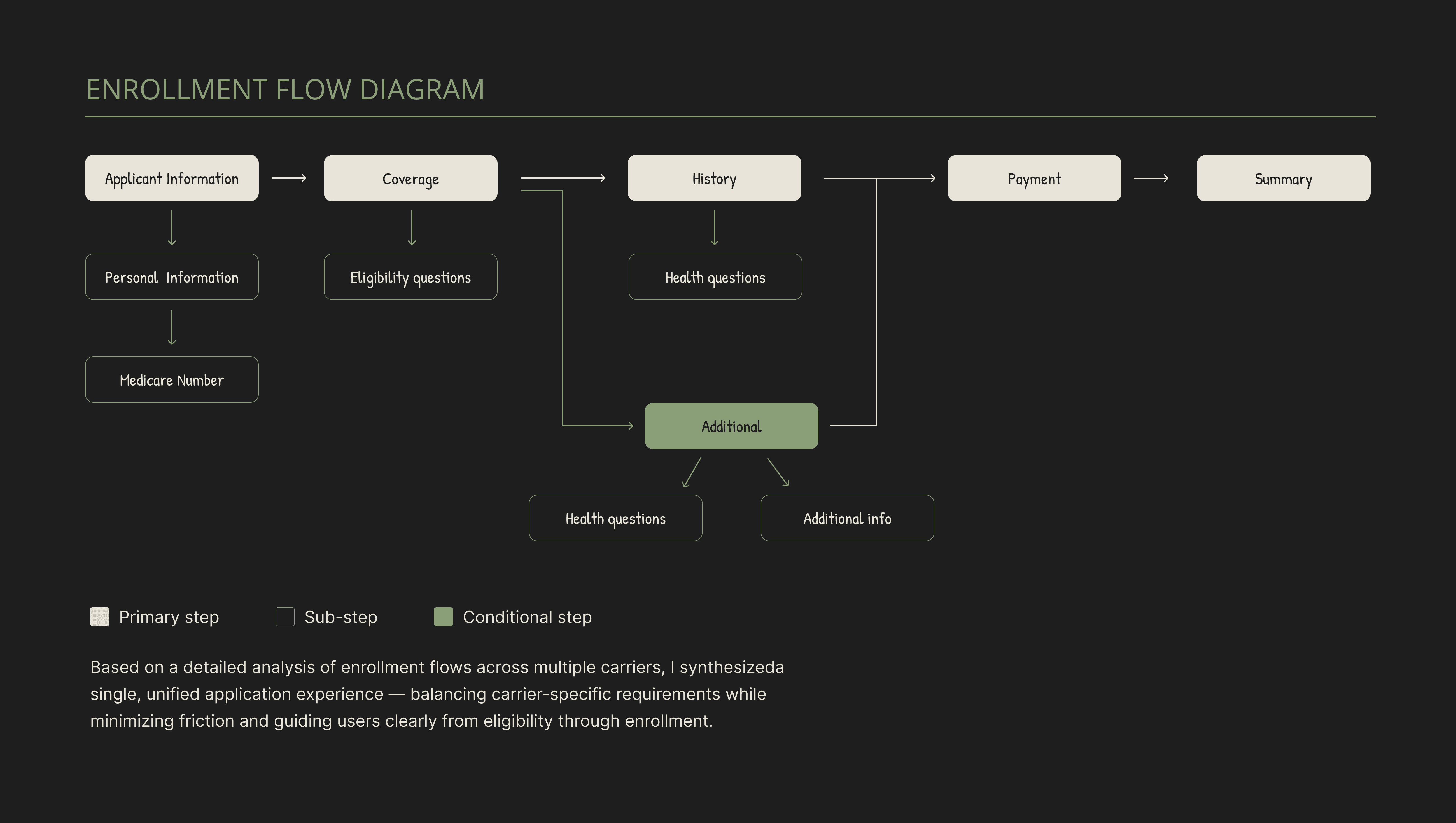 I synthesized enrollment requirements across multiple carriers into a single unified application architecture that branches intelligently based on eligibility and carrier rules.